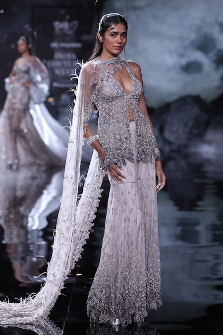 Grey Tulle Sequins, Beads, Feathers Plunge Lydia Embroidered Top Sharara Set