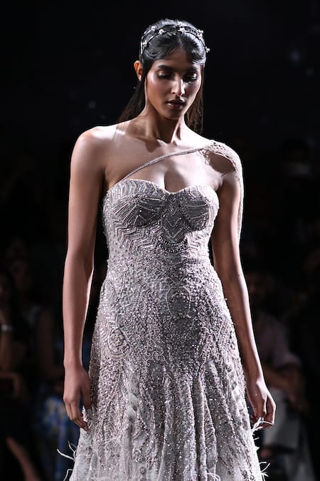 Ivory Tulle Sequins, Feathers One Shoulder Penelope Embroidered High Slit Gown