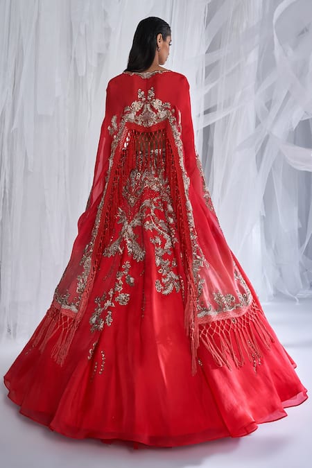 Red Organza Embroidery, Lace Sweetheart Neck Sintra Kamdani Lehenga And Cape Set