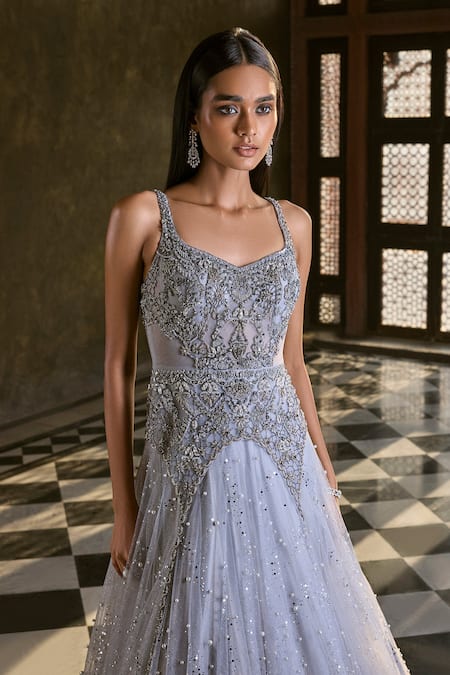 Grey Tulle Sequins, Beads, Cut Work Sweetheart Neck Tonal Embroidered Gown