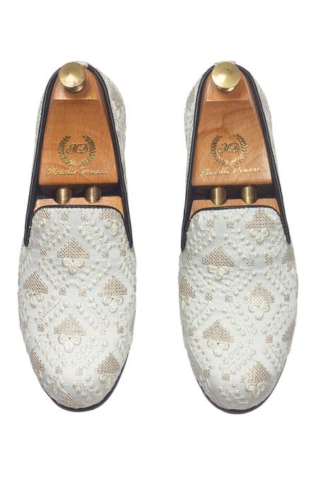 Cream slip-on shoes featuring embroidered geometric motifs
