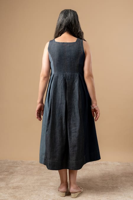 Blue dress made from upcycled denim featuring a square neckline and pleated design