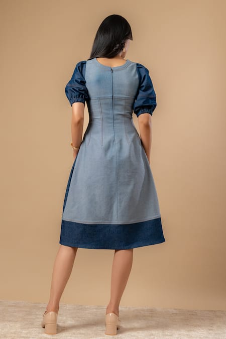 Blue dress made from upcycled denim featuring puff sleeves and a square neckline
