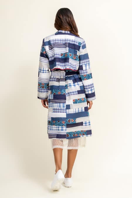 Blue Cotton Patchwork Collared Contrast Work Trench Jacket