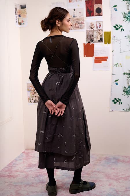 A grey organic cotton strappy tunic featuring a deep back with cross-string detailing and an adjustable drawstring waist. Paired with a grey organic cotton layered gathered skirt with an elasticated waistband, both components are naturally dyed with a bandhani pattern.