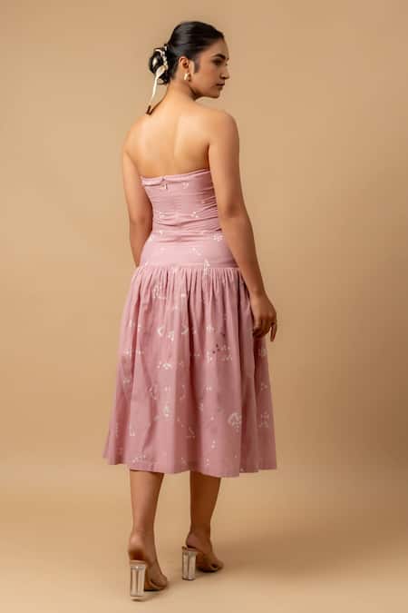 Pink dress made from natural dyed bandhani fabric featuring a strapless design