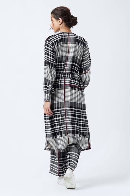 Black & white straight jacket-style tunic with all-over checkered detail, cuff sleeves & side slits. Comes with belt.