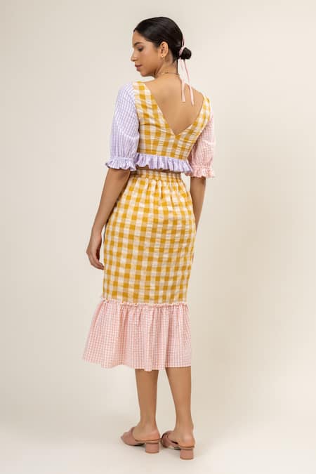 Multi color half puffed sleeves crop top in upcycled cotton base with seersucker checkered pattern & V neckline. Paired with matching ruffled skirt.
