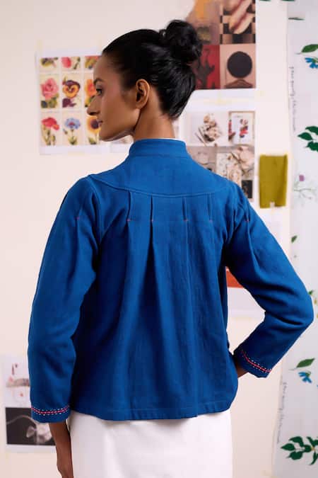 Blue Cotton Embroidery Mandarin Collar Varna Band Jacket