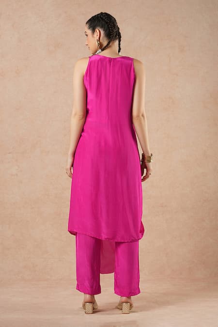 Hot pink kurta in pure silk crepe featuring metal hand embroidery at the neckline. Paired with matching pants for a coordinated look.