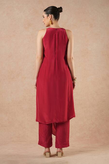 Ruby red kurta in pure silk crepe featuring metal hand embroidery at the neckline. Paired with matching pants for a coordinated look.