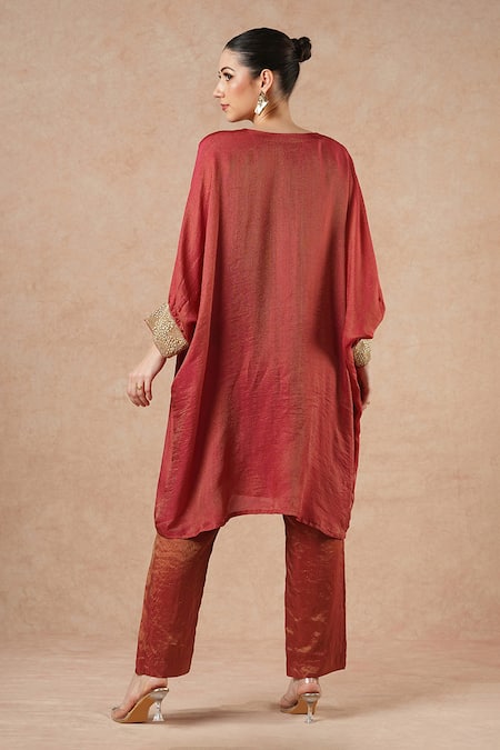 Ruby red kurta featuring metal hand embroidery with a V-neckline and wide sleeves. Paired with coordinating pants in gold stripe tissue silk fabric.
