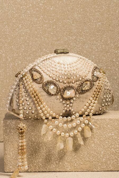 Ivory semi-circular clutch featuring dori necklace embroidery and beaded tassel details