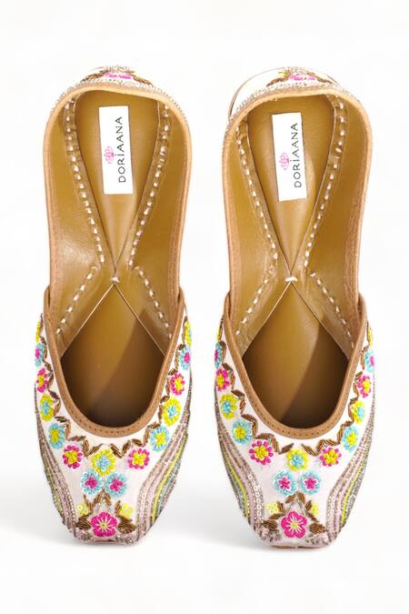 White juttis featuring closed shoe pattern with all over floral and stripe design