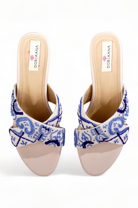 Blue and white block heels featuring criss-cross straps and abstract thread work embroidery