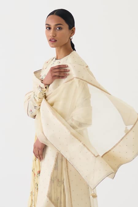 Ivory dupatta crafted in organza featuring gold toned buta embellishments