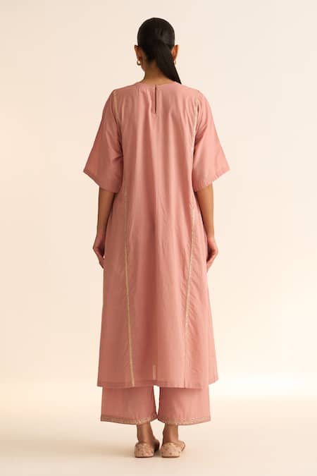 Old rose kurta featuring geometric bead embroidery with elbow sleeves. Paired with matching pants that have embroidered hems.