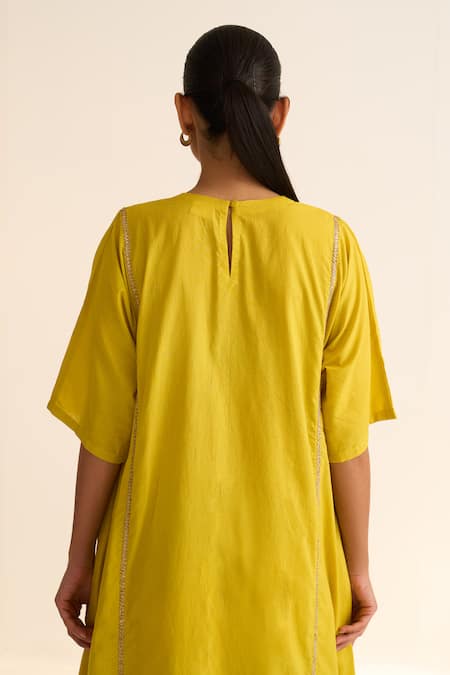 Yellow kaftan style kurta featuring placement embroidery and elbow sleeves. Paired with matching embroidered pant.