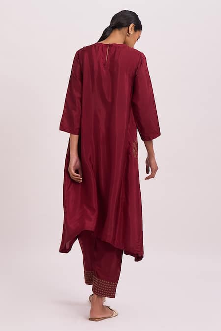 Maroon Cotton Silk Resham And Zari Work Round Asymmetric Kurta & Pant Set