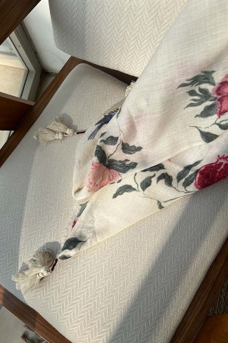 Ivory cashmere shawl featuring floral bloom and anaar prints with tassel edges