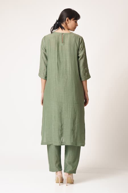 Sage green kurta with all-over floral motif work & side slits. Comes with straight pants.