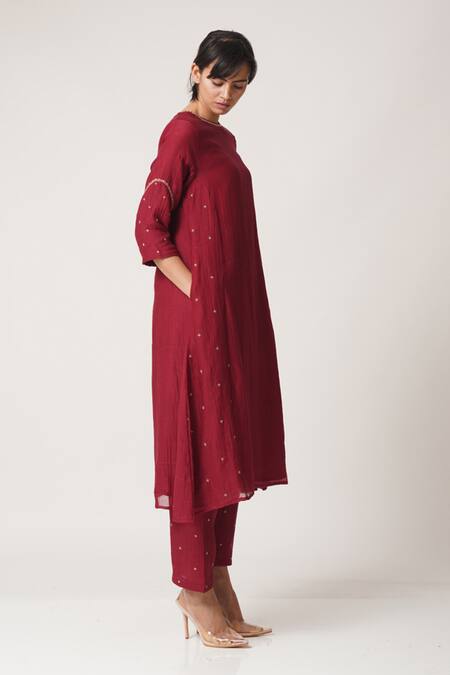 Maroon flared kurta with placement floral zari, dabka work & side panels. Comes with straight pants.