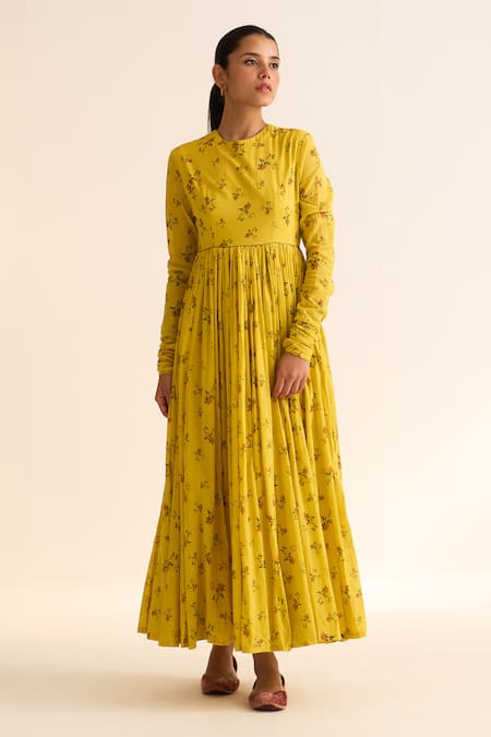 Yellow floral printed anarkali featuring gathered flares and a round neckline. Paired with a matching pant for a complete look.