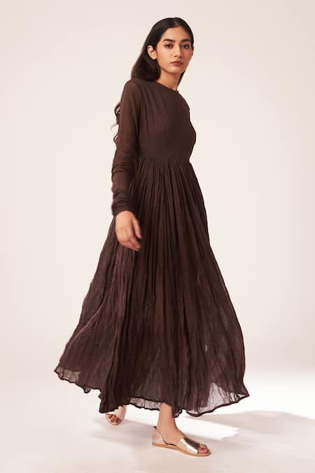 Brown anarkali with front gathers, sheer sleeves & gathered sleeves.