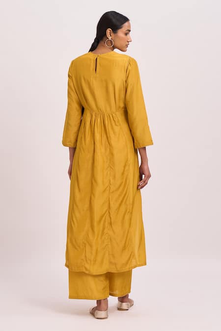 Mustard embellished kurta with three-fourth sleeves. Paired with a floral chanderi scarf & pant.