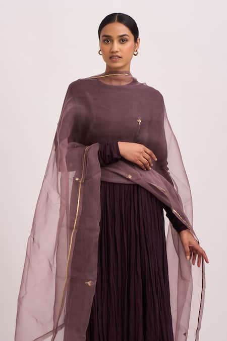 Wine cotton silk anarkali with zari embellishments. Paired with embroidered pant.