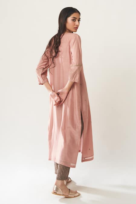 Pink Cotton Silk Round Embroidered Kurta And Pant Set