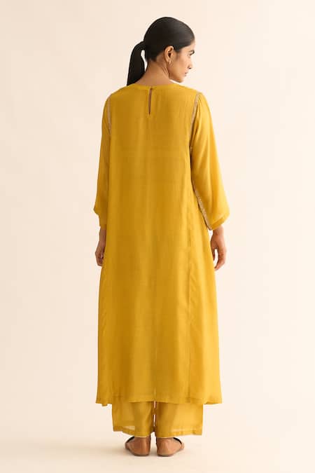 Yellow kurta featuring round neck, three quarter sleeves, and gold dabka hand embroidery. Paired with straight fit pants, the kurta includes side pockets and a keyhole back.