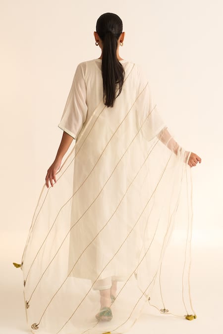 Ivory kaftan style kurta crafted in cotton silk with intricate resham and dabka embroidery. Paired with a straight silk pant and a dupatta featuring decorative tassels and embroidered accents.