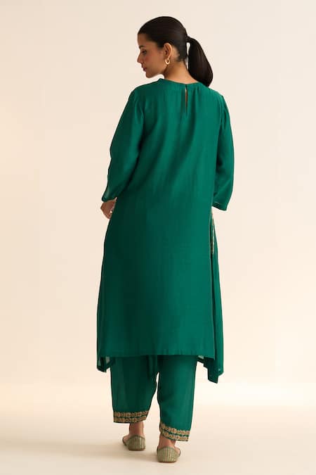 Green Cotton, Silk Embroidery Round Neck Mysa Placed Asymmetric Kurta With Pant