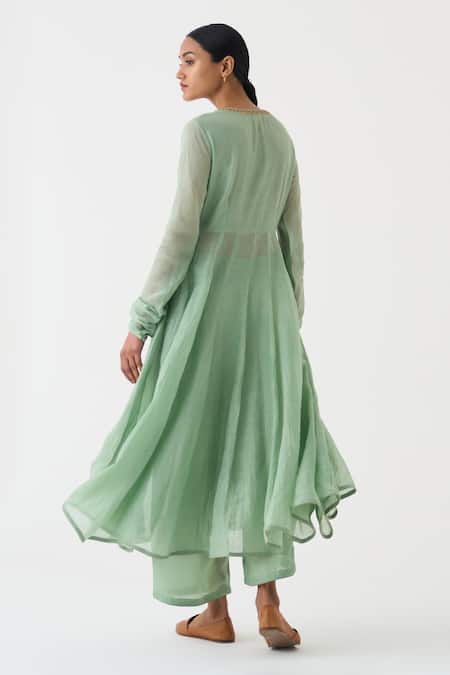 Mint green chanderi anarkali featuring a round neckline with zari embroidery and front button closure. Paired with a cotton silk pant and an organza dupatta adorned with delicate embellishments.