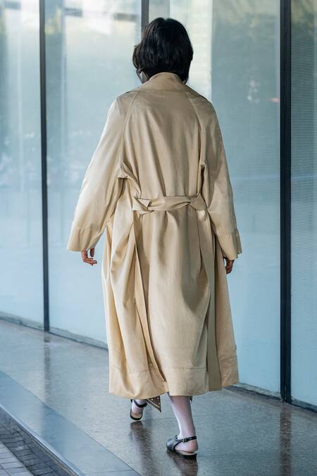 Tie-up belt detail, Double breasted design, Collared neckline