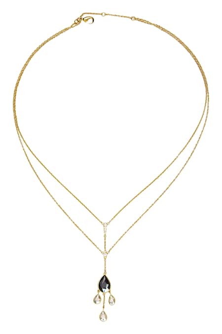 Reinvent the codes of elegance with this double stranded necklace showcasing a white crystal studded black pendant.