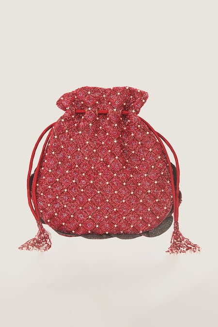 Red potli bag featuring bead and pearl embellished floral applique pattern