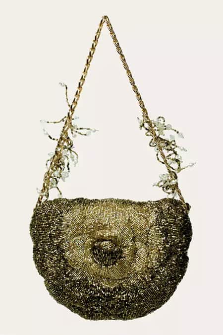 Gold mini sling bag featuring a handcrafted rose pattern with hand embroidery and embellishments. Includes a detachable shoulder strap and an extra metal chain strap.