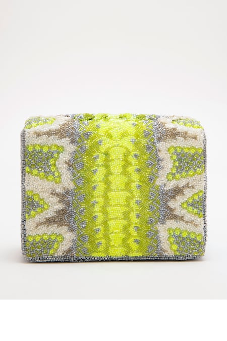 Green handbag featuring an ombre scalloped pattern embellished with Japanese bugle beads