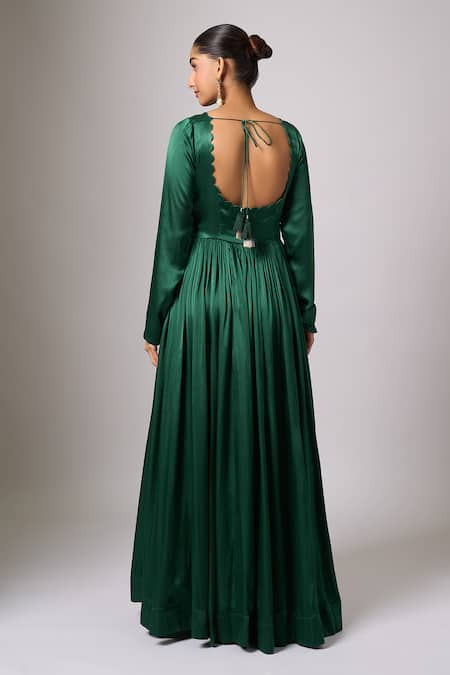 Dark green satin Anarkali with a scoop neckline and long sleeves. Paired with an organza dupatta featuring embellishments.