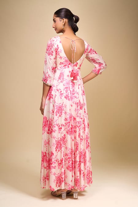 White and pink floral print Anarkali featuring a square neckline and three-quarter sleeves. Paired with a coordinating dupatta adorned with embellishments.
