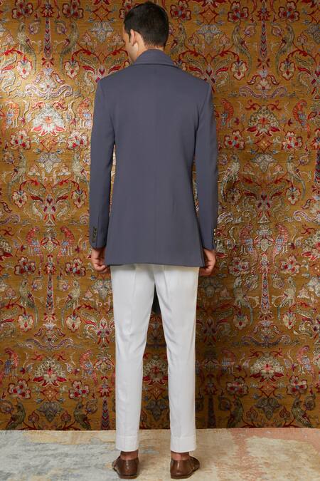 Grey bandhgala with front button closure & attached drape. Comes with plain straight pants.