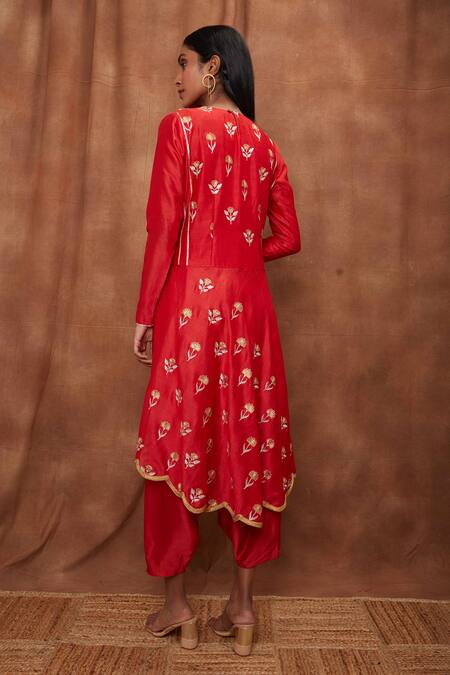 Red draped dhoti pant paired with floral motif zari work asymmetric top.