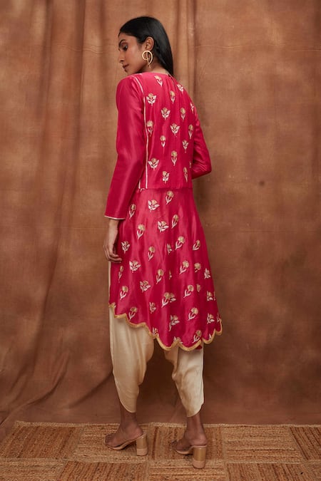 Rani pink draped dhoti pant paired with floral motif zari work asymmetric top.