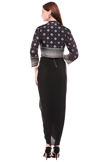 Black draped dress with side cutouts & metallic detail front. Comes with printed short jacket with tassel detailing at the hem.
