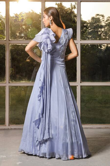 Periwinkle pre-stitched draped lehenga saree in chiffon & organza base. Paired with a bustier & embroidered half jacket with corded power shoulders.