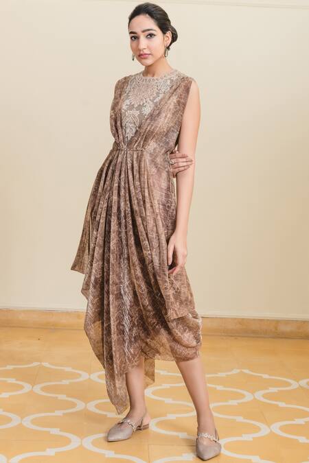 Gold tinted brown dress with floral motif work, cowl drape & uneven hemline.