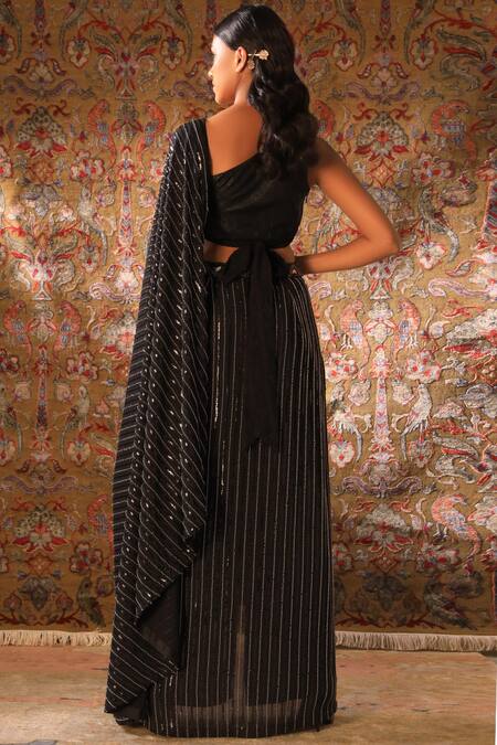 Black layered pants with attached sequin worked saree drape & embellished belt. This set comes with back knot blouse.