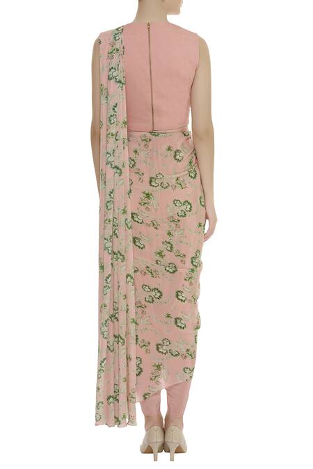 Look uber-fashionable in this exquisite luxurious ensemble. Enhanced with pearl-drops and sequin embroidery around the neckline, this sleeveless blouse comes with an attached floral printed, saree drape. Detailed with a back zipper, this class apart ensemble is coordinated with dhoti pants.